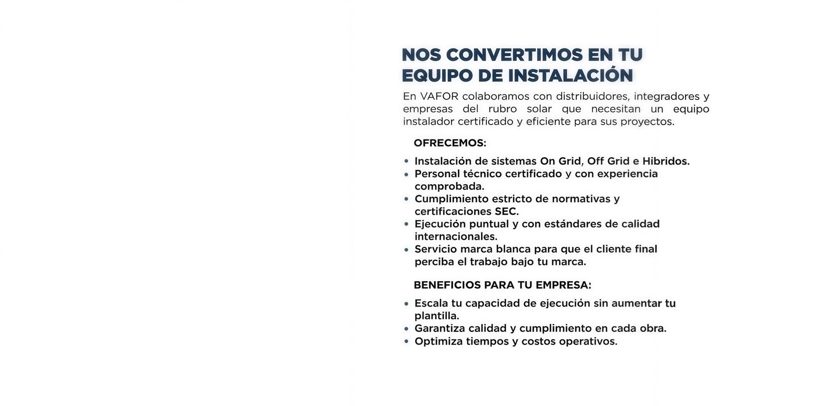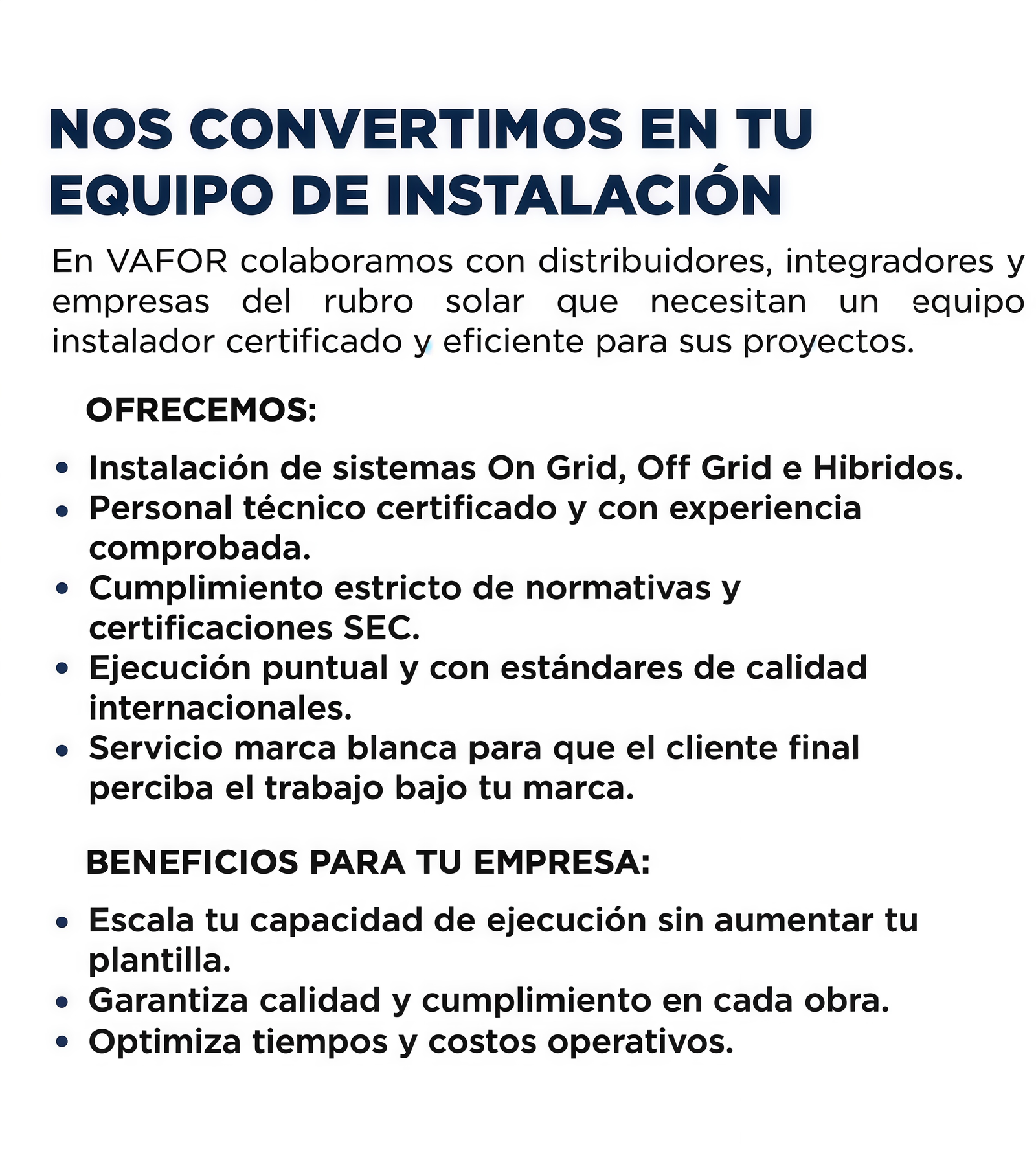 En VAFOR acercamos la energía del sol a hogares y empresas de Chile con soluciones On Grid, Off Grid e Híbridas. Ofrecemos instalaciones certificadas, mantenimiento y respaldo técnico para que disfrutes de energía limpia, segura y eficiente todo el año.