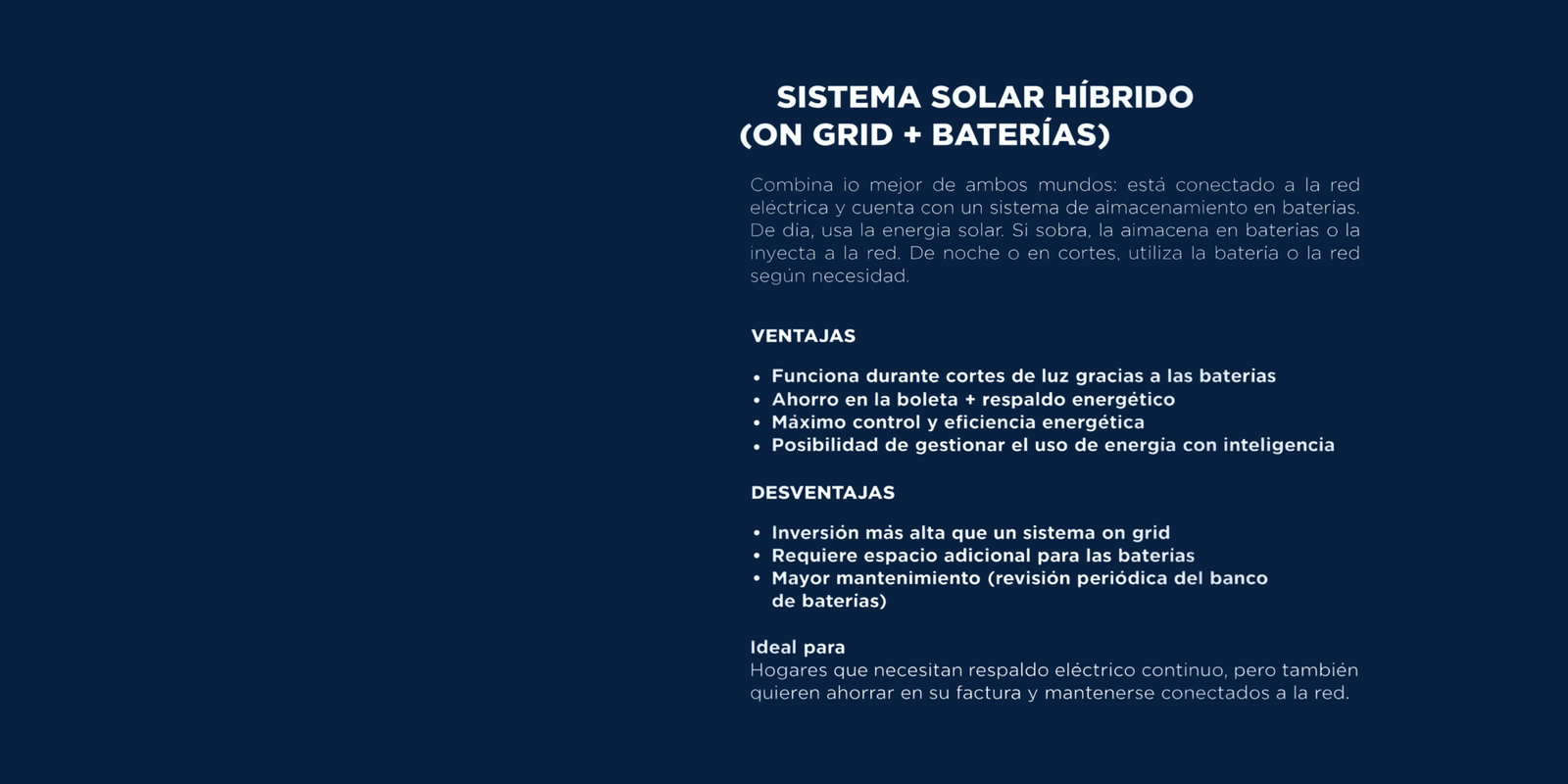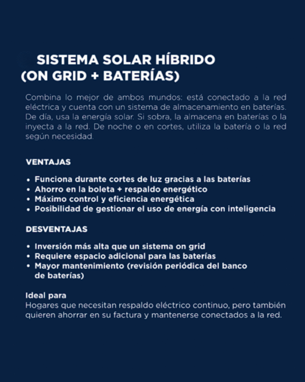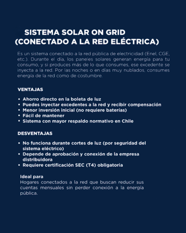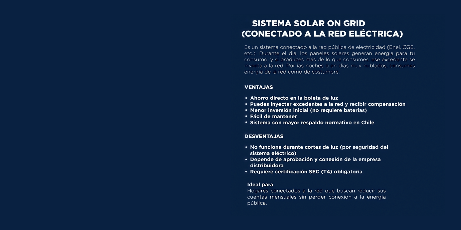 Es un sistema conectado a la red pública de electricidad (Enel, CGE,