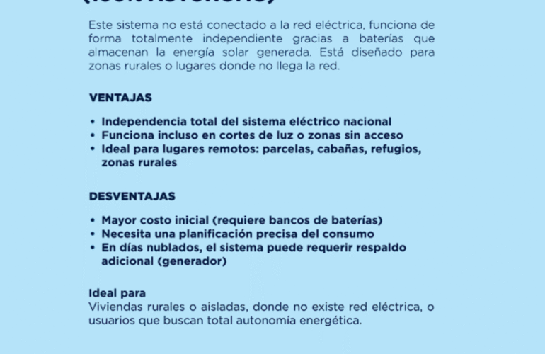 Independencia total de la red, energía en cortes y ideal para zonas rurales.