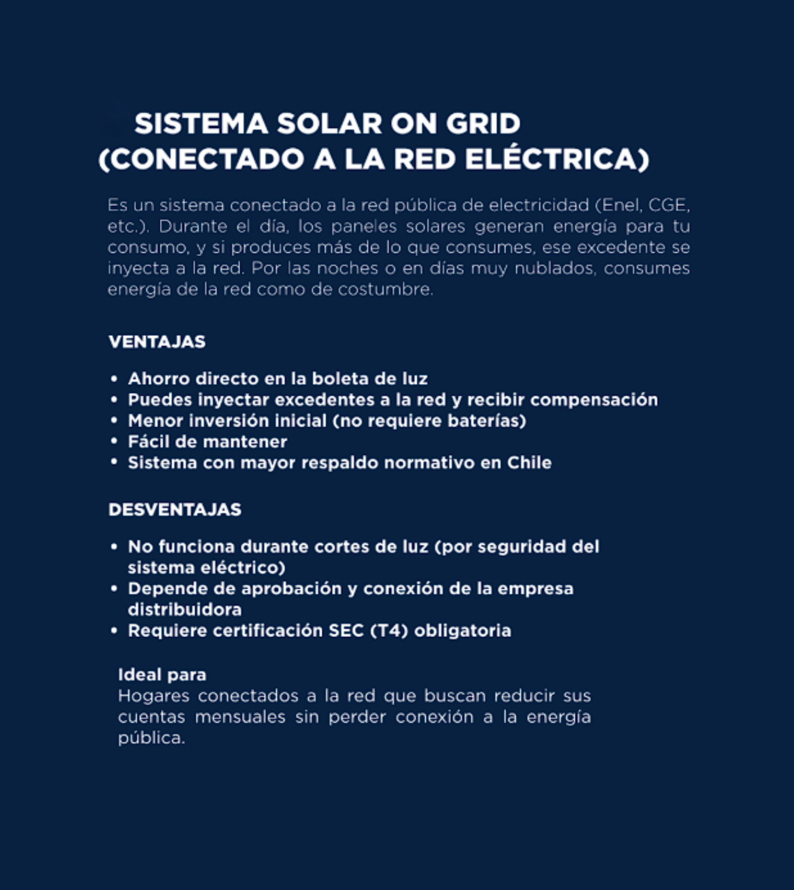 Es un sistema conectado a la red pública de electricidad (Enel, CGE, etc.). Durante el día, los paneles solares generan energía para tu consumo, y si produces más de lo que consumes, ese excedente se inyecta a la red. Por las noches o en días muy nublados, consumes energía de la red como de costumbre.